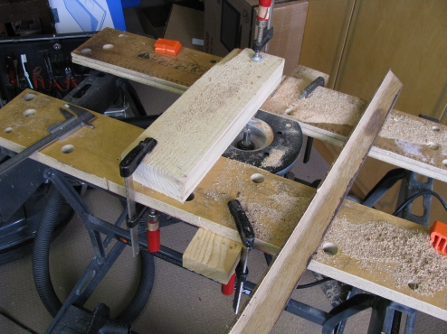 blok hout en de nodige lijmtangen wordt zo een freesbank geïmproviseerd om zo het profiel aan het latje te maken.