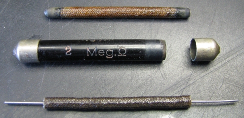 Vervolgens twee weerstandjes van 1Mohm in serie in een stukje oliekous geschoven